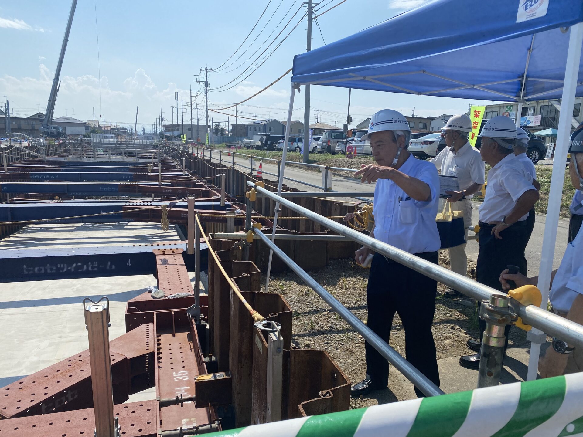 旧川本町内、県道深谷嵐山線と秩父鉄道をアンダーパスにより立体交差化する工事が開始されました。線路に架設の橋を架け掘削を行い、ボックスカルバートのコンクリート構造物を構築します。この鉄道直下部分の工事の事業費は、約18億円、令和9年度まで工事を行い、その後、スロープ部を含めた周辺部分の工事を進めます。